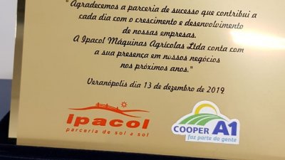 O gerente das lojas agropecuárias, Mário Grisotti esteve presente e comentou sobre a representatividade da homenagem como empresa que mais comprou da Ipacol: “somos uma empresa de 86 anos, no ramo de máquinas agrícolas, atuamos cerca de 12 anos. E por isso, entendemos que a Cooper A1 está sendo um destaque na venda de produtos desta linha”. Ainda segundo Mário, a homenagem prestada aos profissionais envolvidos ao setor é gratificante e incentiva para realizar um bom atendimento e aumentar às vendas. No decorrer da visita, a equipe da Cooper A1 foi recebida pelos proprietários, técnicos e engenheiros da Ipacol. Foram feitas demonstrações de máquinas que estão entrando no mercado para solucionar problemas, como: Subsolador com desarme pneumático; Distribuidor de Fertilizantes a lanço; Distribuidor de fertilizantes sólidos (identificada como alternativa para distribuição de cama dos compst Barn); Vagão vertical com misturador e balança; E distribuidor de adubo orgânico líquido. A Ipacol é uma empresa familiar, cujo o nome traz lembrança ao seu fundador com as iniciais do seu nome: Ildo Parise & Companhia Ltda. A empresa iniciou suas atividades em 1976, com uma enxada rotativa e hoje possuí um portfólio diversificado de máquinas agrícolas para servir todos os produtores, sejam de pequeno, médio ou grande porte.