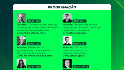A programação será finalizada com live do historiador Leandro Karnal sobre O papel da mulher no cooperativismo, na sociedade e no mercado de trabalho. A importância da mulher como formadora do núcleo familiar, independência econômica, direcionamento do consumo e capacitação para competir no mercado serão alguns dos aspectos abordados.